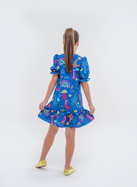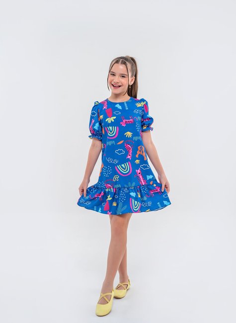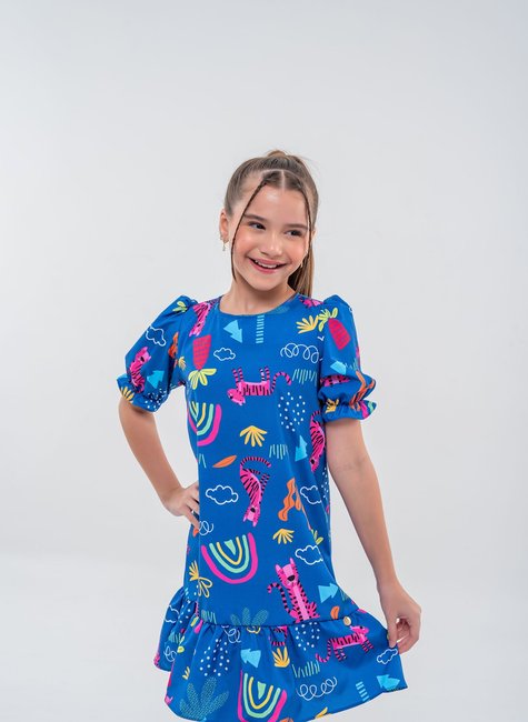 Prepare-se para um look cheio de personalidade e diversão com este vestido infantil azul! A peça destaca-se pela estampa super criativa que mistura tigres, arco-íris e nuvens, criando uma combinação lúdica que vai encantar as crianças. Com um fundo azul vibrante, os detalhes em cores vivas trazem uma sensação de aventura e alegria, transformando este vestido em uma escolha perfeita para momentos de descontração e diversão.